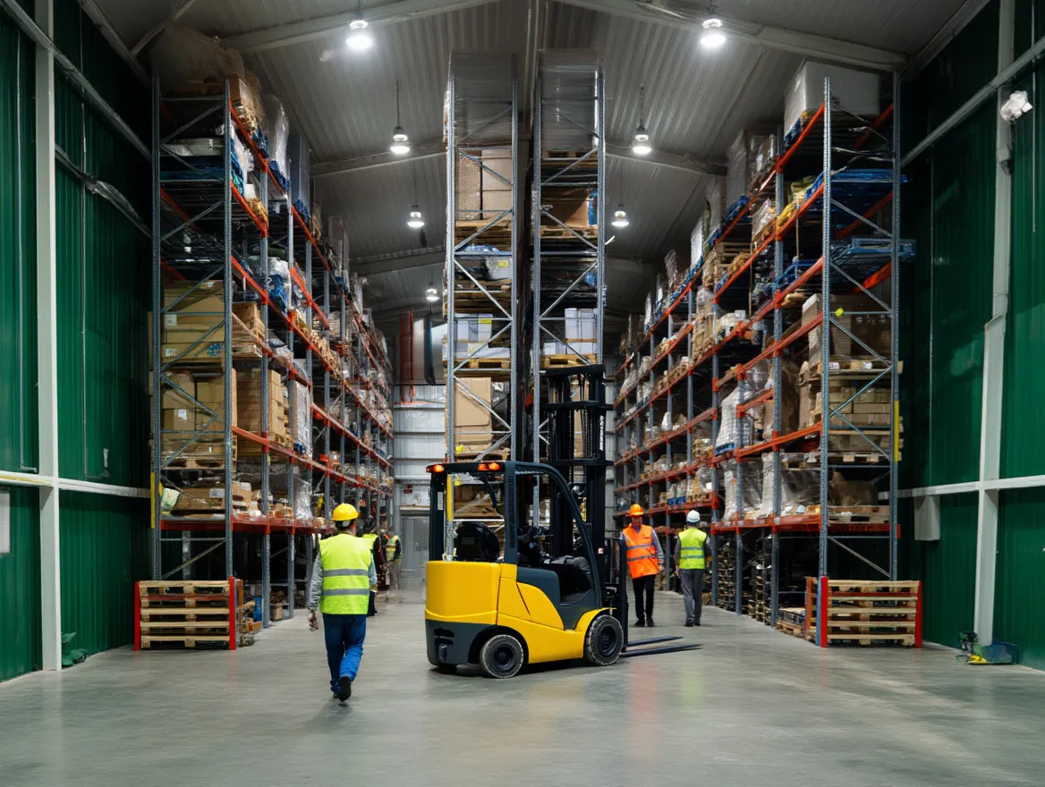 Пространство склада разделено на функциональные зоны, обеспечивающие удобство эксплуатации и соблюдение норм охраны труда: